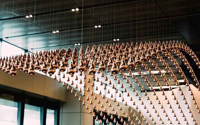 Réalisée par Art+Com, cette installation inspirée d’une sculpture de 2008, comporte 608 gouttes de pluie en aluminium léger recouvertes de cuivre. Suspendus par des files en acier, elles nous proposent de superbes chorégraphies orchestrées par les calculs d’un ordinateur.