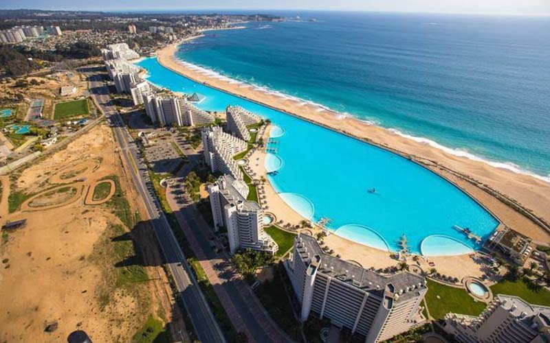 La plus grande piscine du monde est séparée de l’Océan Pacifique par une langue de sable de 100 mètres de largeur. Avec 1km de long et 250 millions de litre d’eau, c’est pratiquement un océan devant l’océan. Les dimensions hors du commun lui ont valu d’entrer dans le Guinness de records.